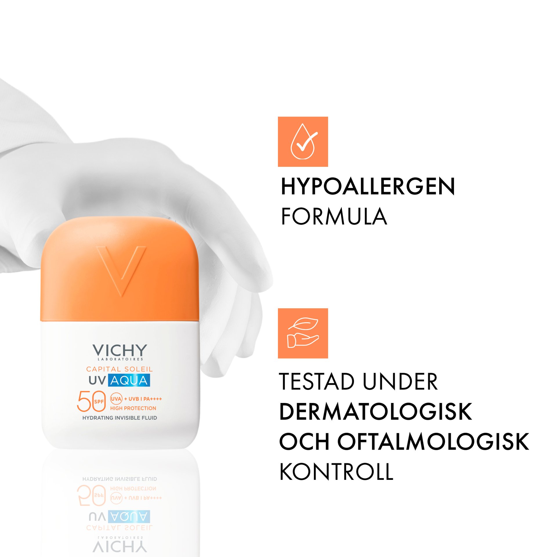 Vichy Capital Soleil UV-Aqua Hydrating Invisible Fluid SPF50 är en återfuktande, osynlig solkräm för ansiktet och ögonområdet som erbjuder avancerat dagligt skydd. Med en textur så fräsch och så osynlig att den känns som vatten. Den ger högt UV-skydd och 24-timmars återfuktning, med en precis applicering för en maximalt behaglig upplevelse. Osynlig finish på huden och känns inte fet. Praktisk och lätt att ta med sig.